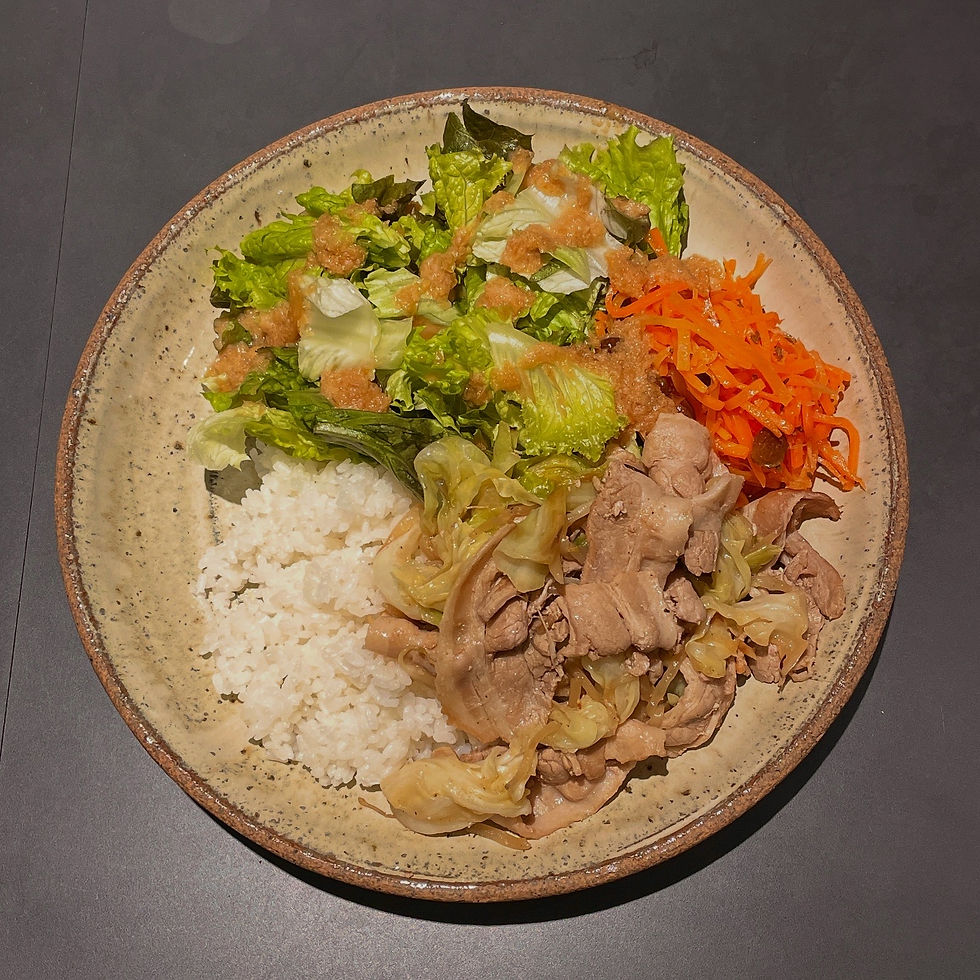 メイン+サラダ+キャロットラペのワンプレートで(丼ものやボウル系もあります)、メニューは日替わりで提供しています!!サラダにかけるドレッシングは手作りのもので、こちらも日替わりになります!ドレッシングはみなさんからも大好評で、野菜が進みます😊